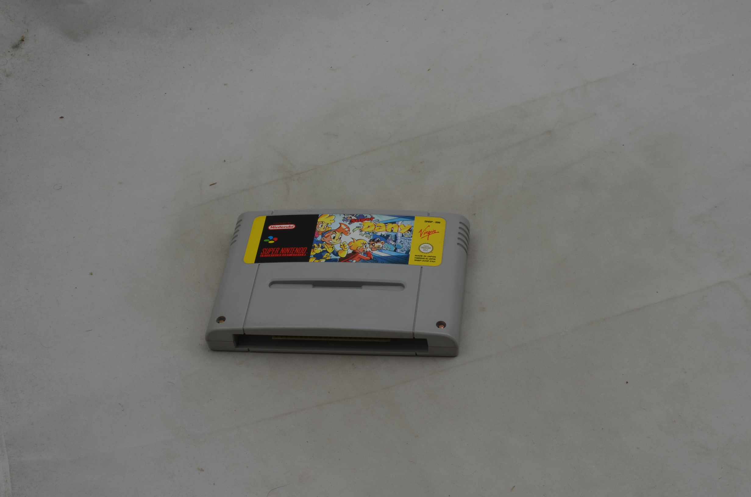 Verkauft wird das Spiel Super Dany für den Super Nintendo. Bild nicht zwingend ein Originalbild. Modul ist in jedem Fall in spielbarem Zustand. Label grundsätzlich OK, höchstens kleine Ablösungen des Labels oder minimal fehlende Teile des Labels sind toleriert. Die meisten Module sind jedoch einwandfrei.