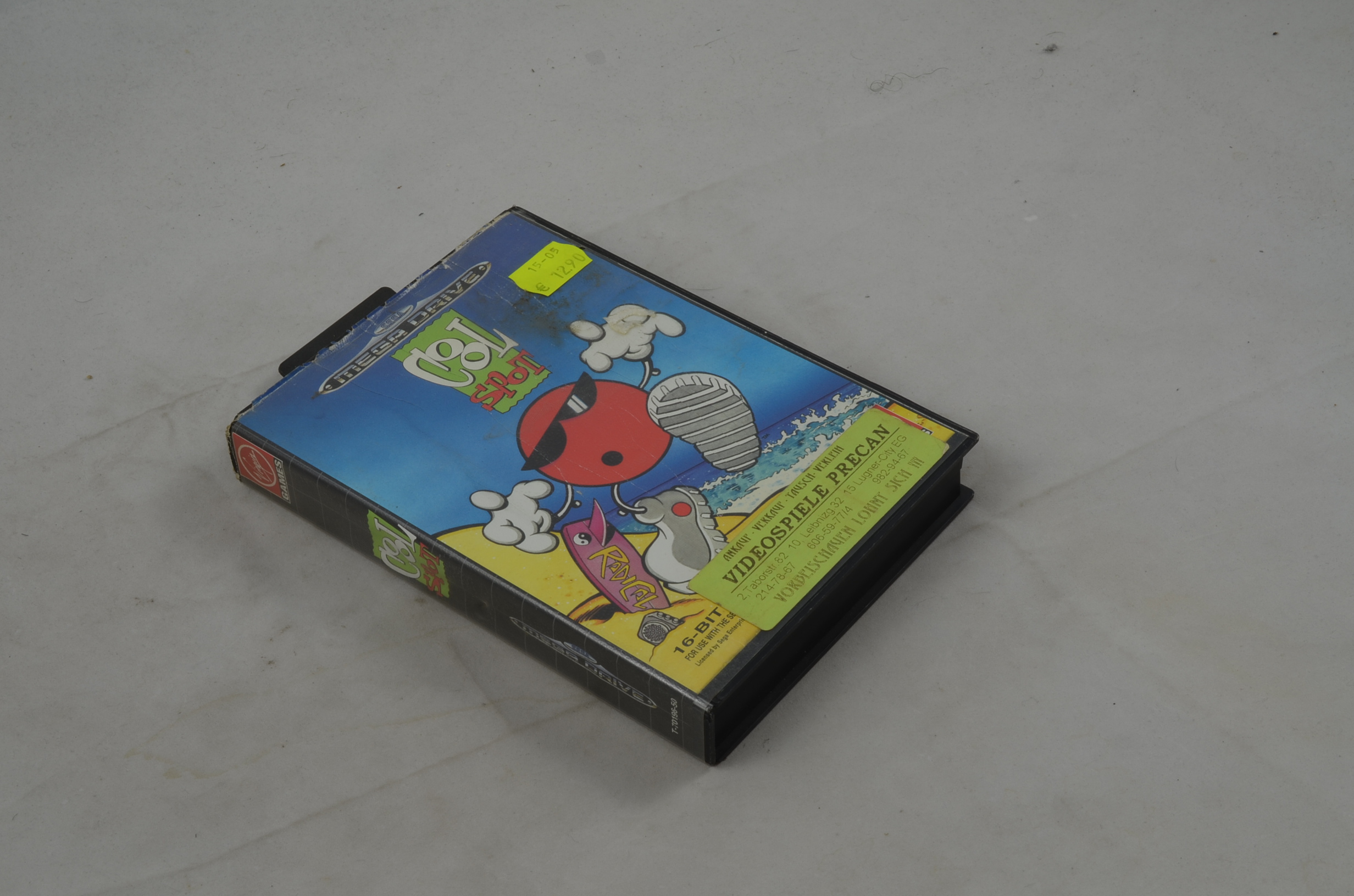 Verkauft wird das Spiel Cool Spot für den Sega Mega Drive mit der Originalverpackung. Die Anleitung ist leider nicht dabei. Originalbilder.
