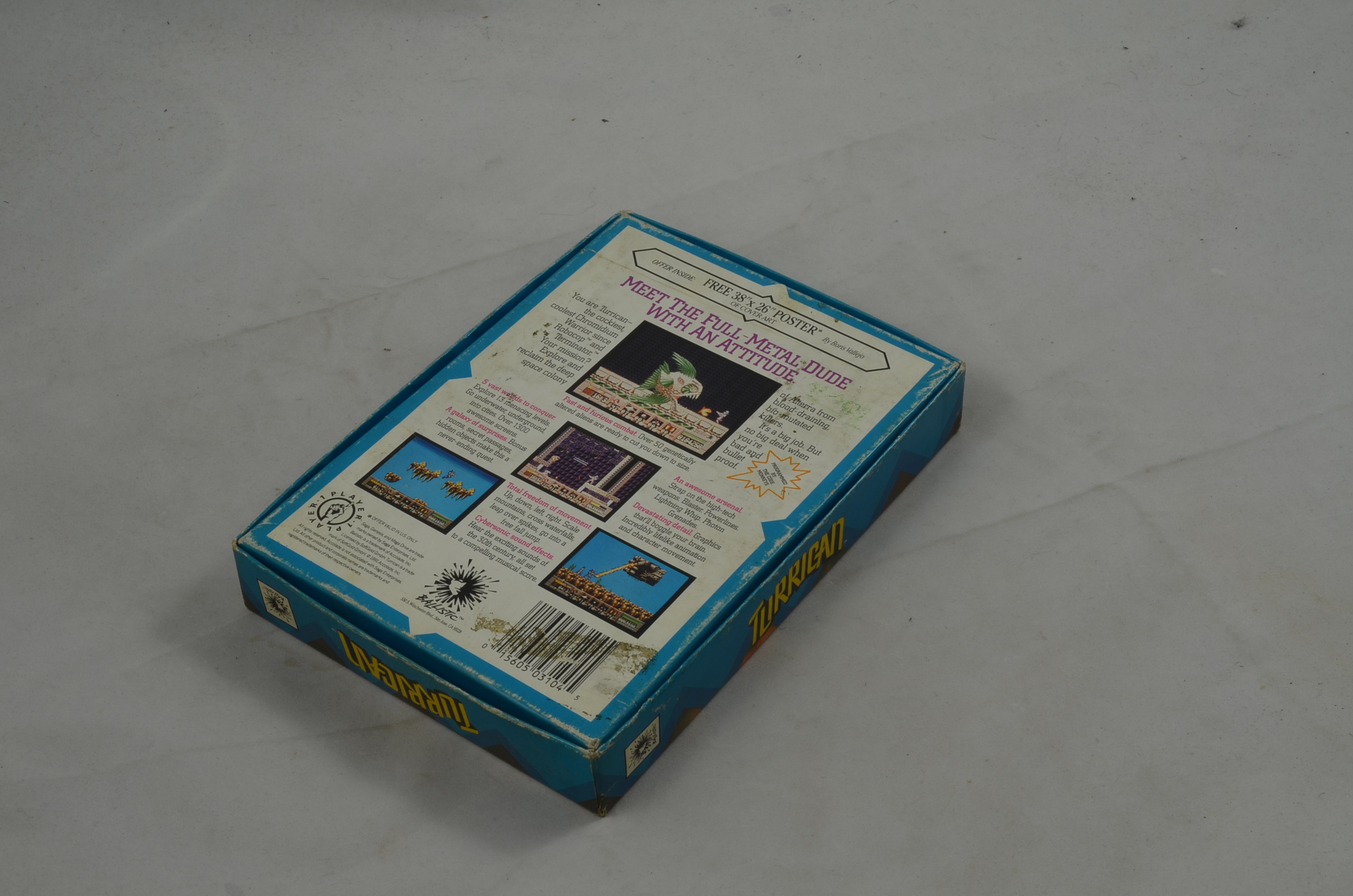 Verkauft wird das Spiel Turrican für den Sega Mega Drive mit der Originalverpackung. Die Anleitung ist leider nicht dabei. Originalbilder.