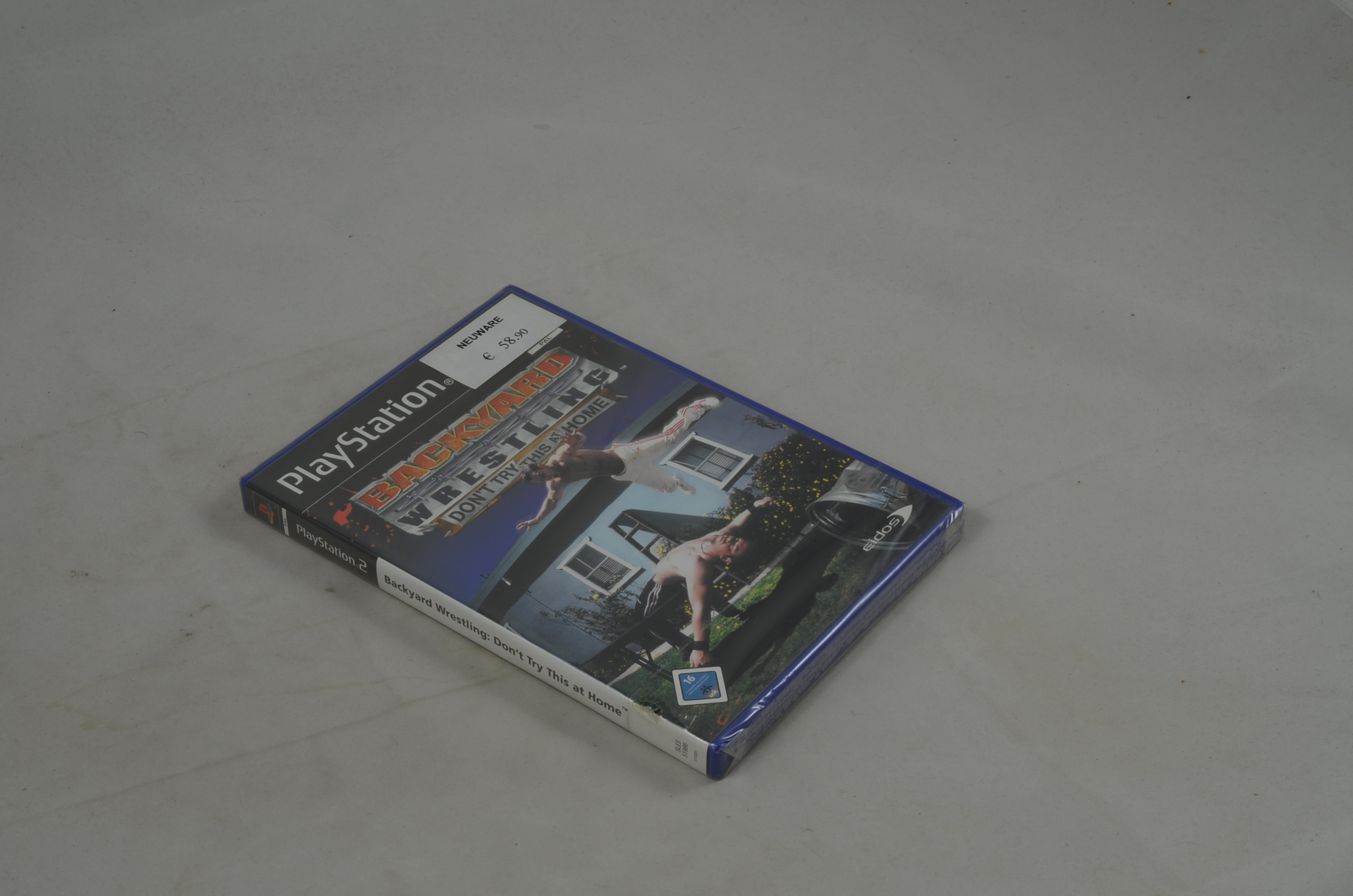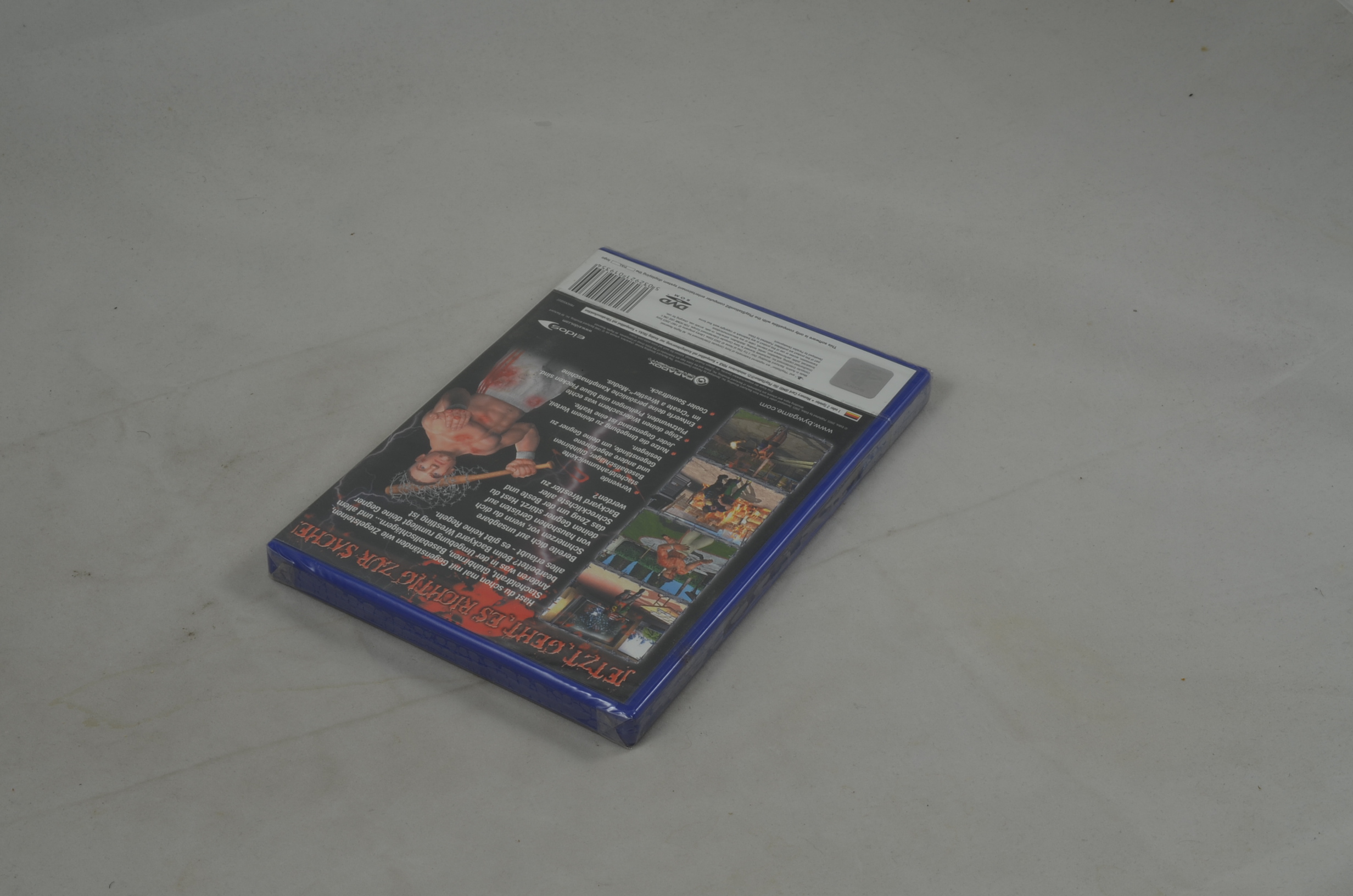 Verkauft wird das Spiel Backyard Wrestling: Don't Try This At Home für die Playstation 2 in neuem Zustand. Die Verschweissung ist nicht vollständig. Originalbilder.
